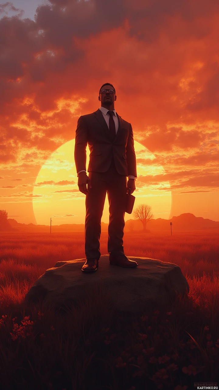 a dramatic sunset. The individual appears to be wearing glasses,