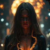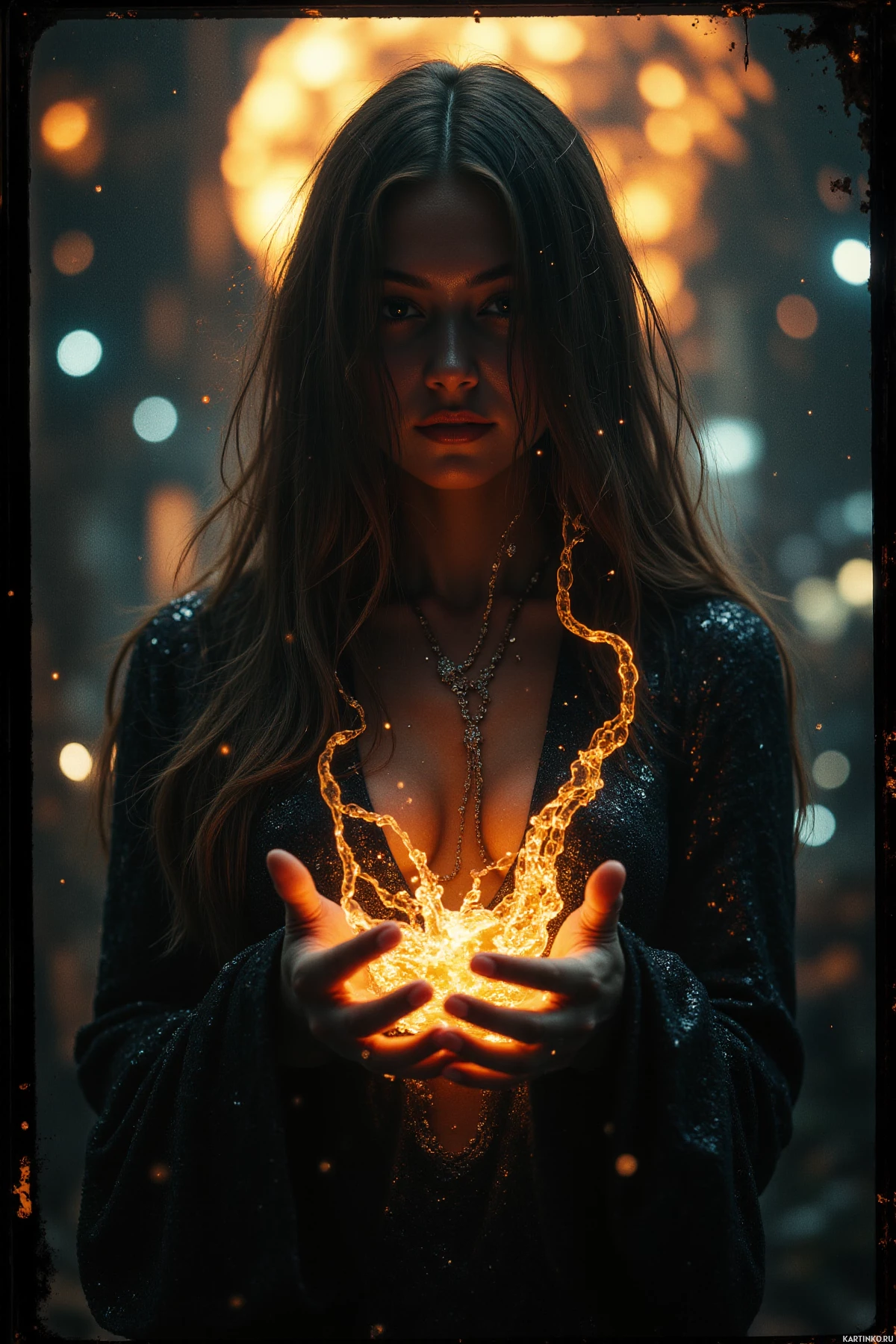 a dramatic effect, highlighting the woman as if she is an ethereal being or witchcraft practitioner casting spells or conjuring magic. There are sparks and small magical effects in the air around her, enhancing the sense of otherworldly power or enchantment.