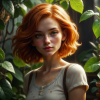red hair, looking towards the viewer. She has a youthful appearance and is wearing what appears to be a light-colored top or tunic. Her skin tone is fair. Behind her, there are lush