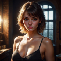 a dark ambiance, featuring what looks like a wooden desk or workbench in the background, and there are shelves holding various items that add to the sense of a detailed environment. The lighting on her face suggests she is being illuminated by a nearby lamp or light source not visible in the frame, which creates