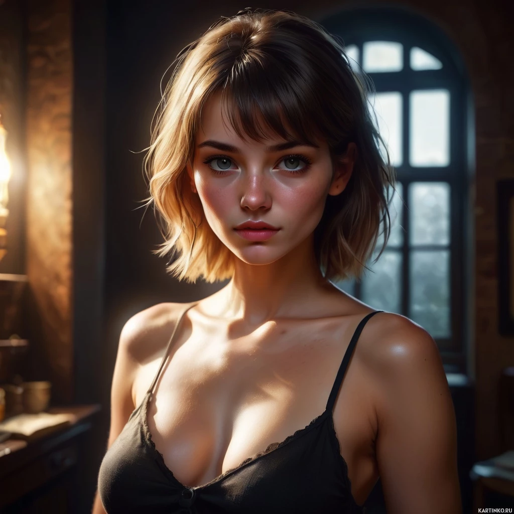 a black top that has thin straps, revealing cleavage and part of her chest. The setting appears to be an indoor room with