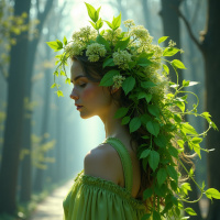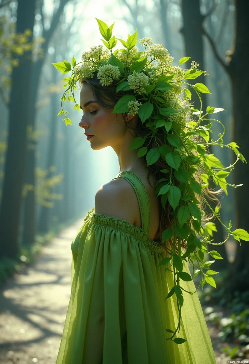 a wooded area or garden. The individual is adorned with a crown of leaves, suggesting a connection to nature or possibly playing the role of
