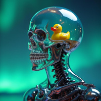 a human head in a highly stylized manner. The artwork seems to blend elements of realism with surrealism or fantasy, given the unusual and playful inclusion of the rubber duck within the skull cavity.