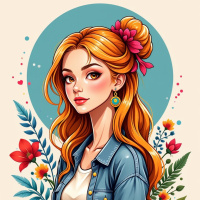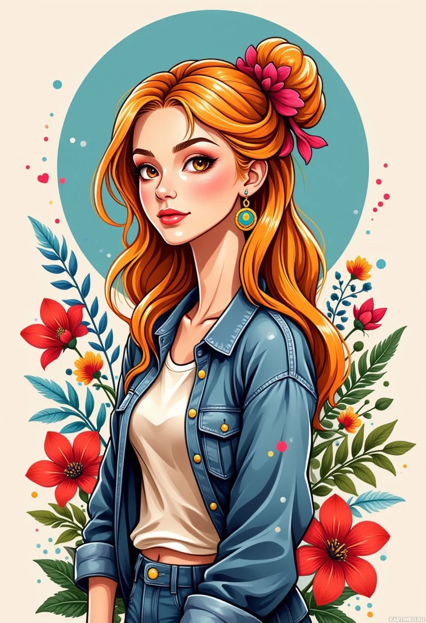 red accents that resemble flowers, adding to the artistic nature of the image. Surrounding her are decorative elements including