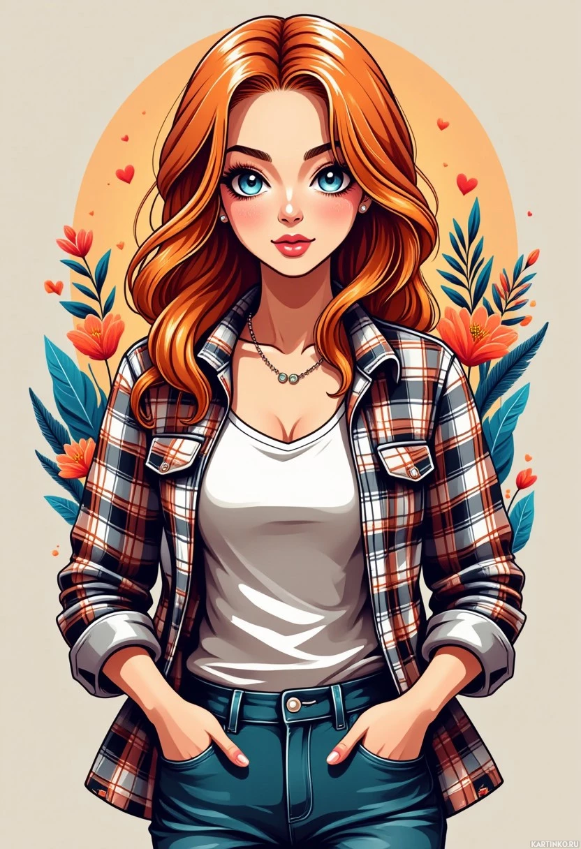 blue jeans, tucked into high-heeled boots that reach just past her knees. The background of the image is a soft gradient from light gray at the top to a warm yellow at the bottom, framed by stylized flowers and plants on either side. The overall style of the artwork is clean and cartoonish, with a hint of whimsy due to the exaggerated features and the floral elements in her hair and the background.