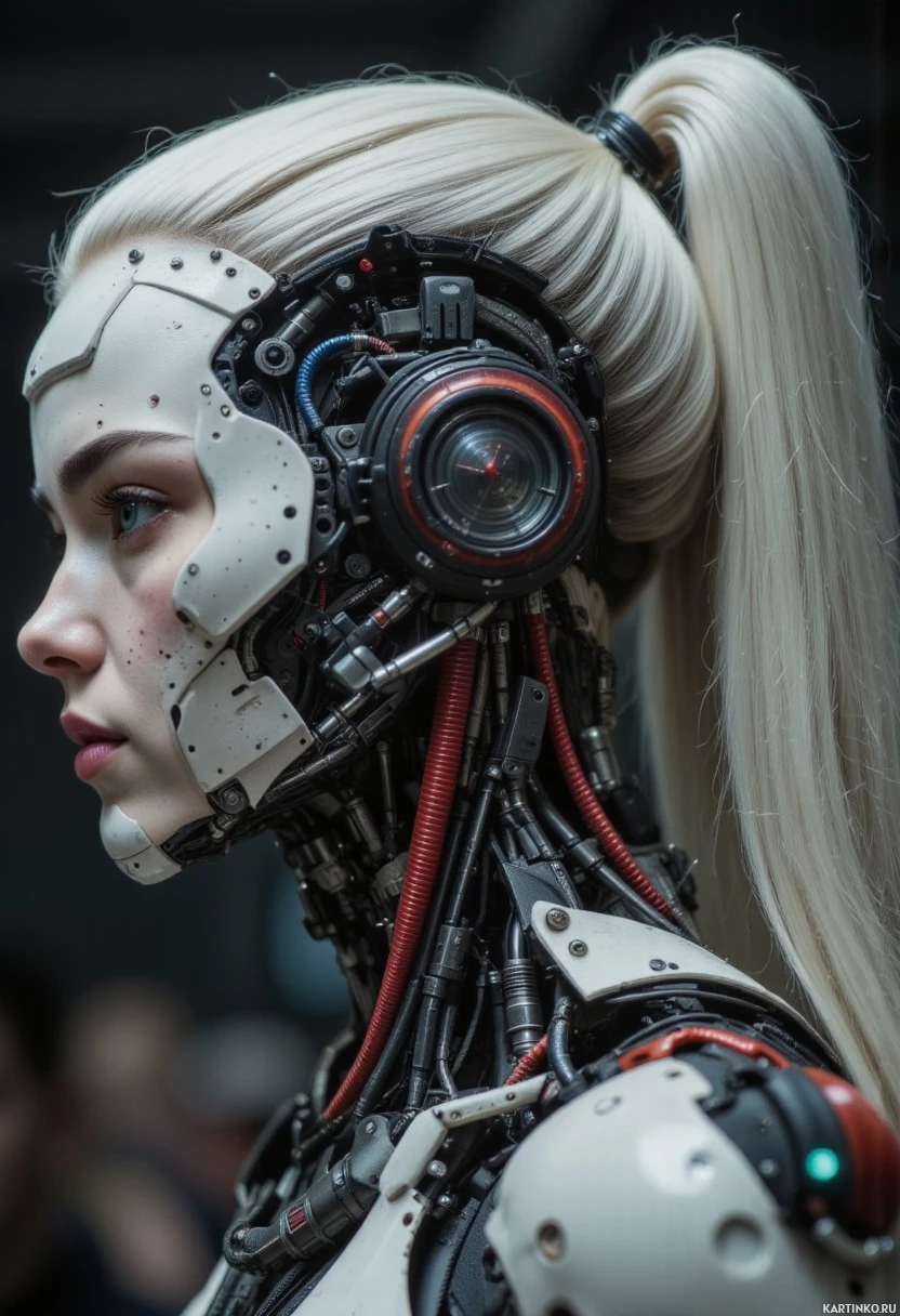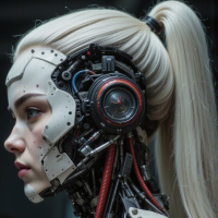 white hair. It is wearing a sophisticated cybernetic head and chest, suggesting advanced artificial intelligence or technology in