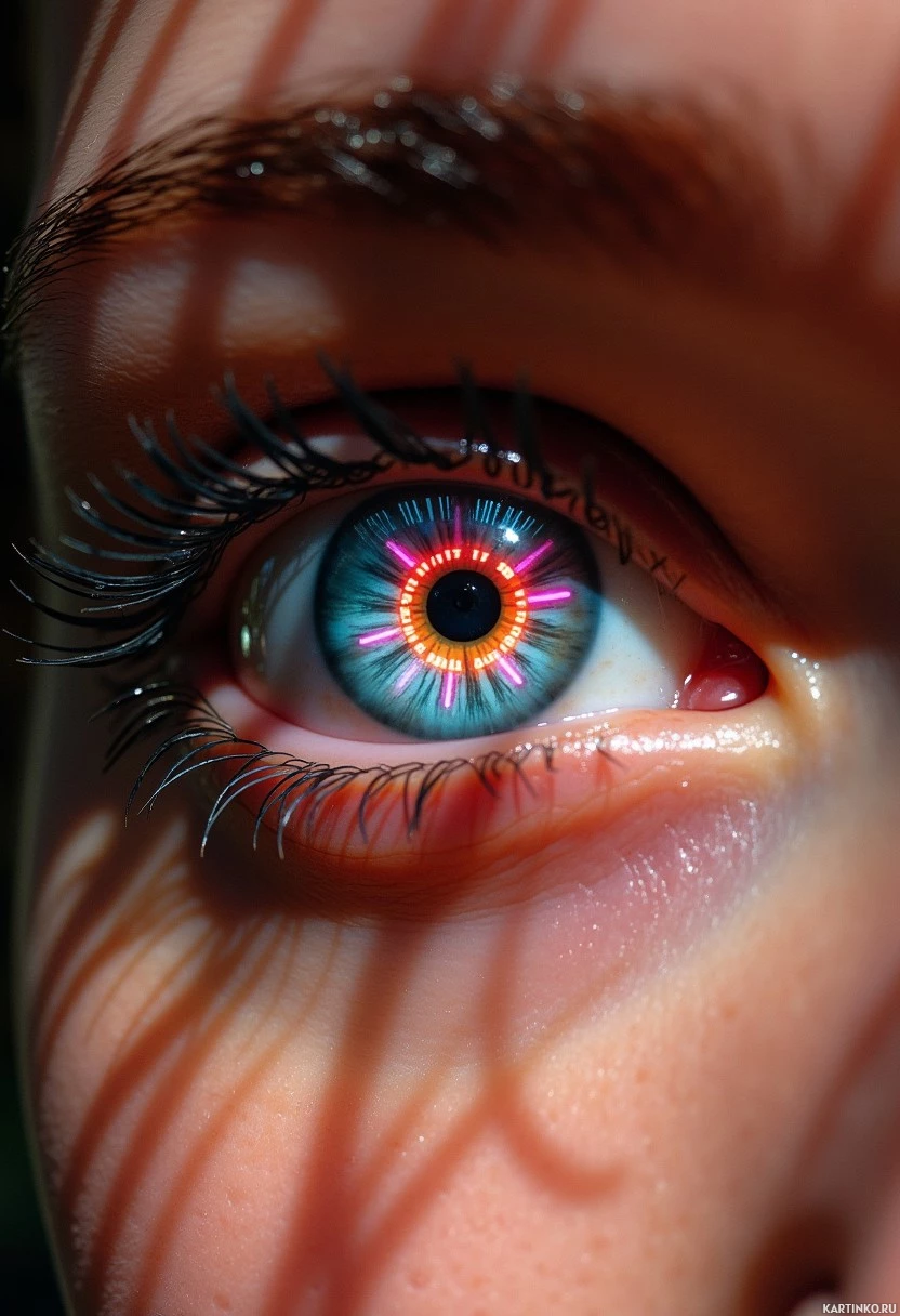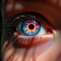 a human eye, with the iris exhibiting a vibrant mix of colors. The pupil is dilated wide open. Above and below the eye are blurred images that appear to be hands resting on or near the eyelid. The overall effect creates an artistic representation of