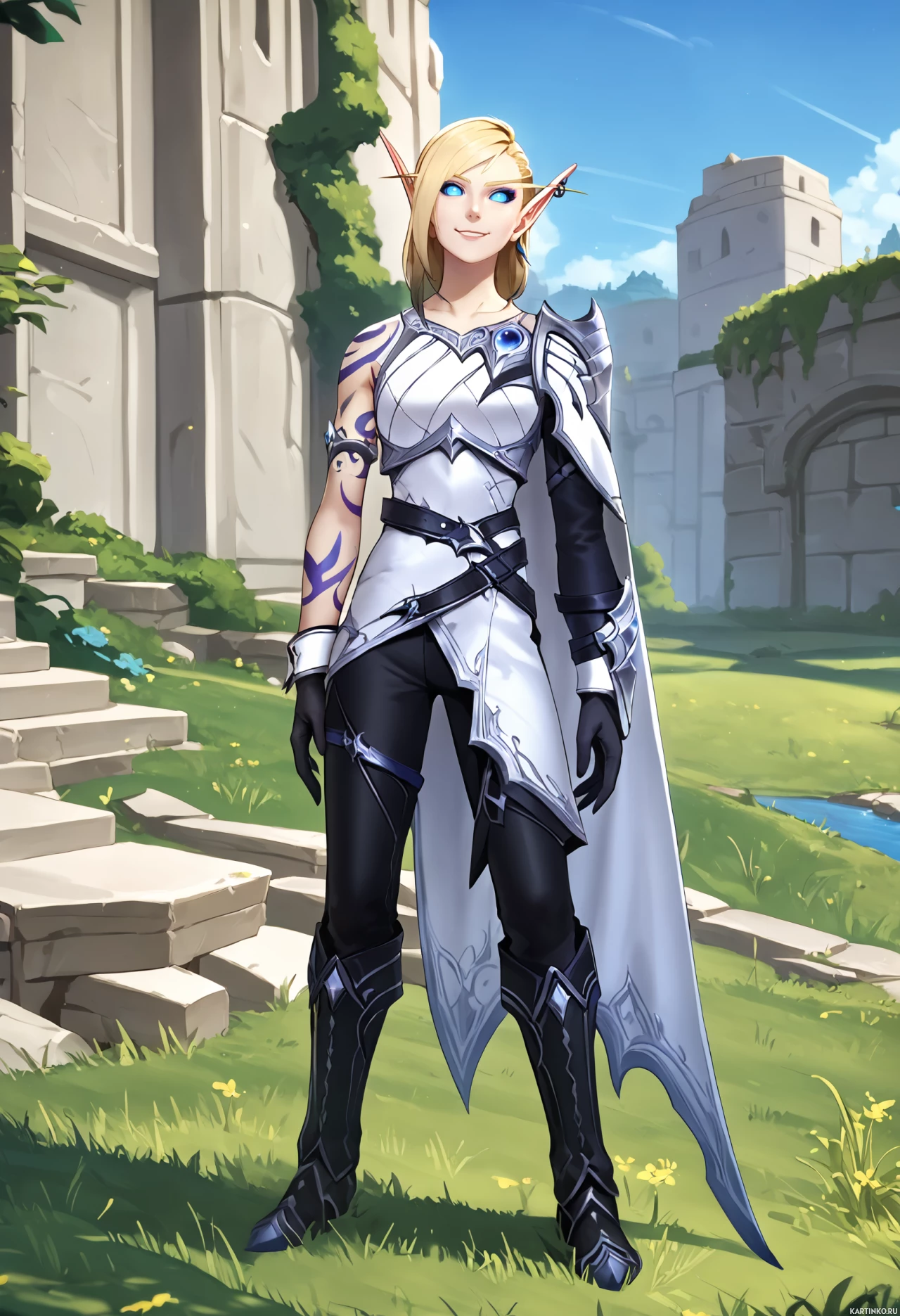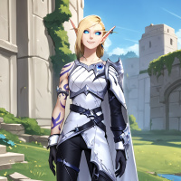 blonde hair and striking blue eyes, which are common traits for fantasy characters in many stories and games. The character is wearing a silver armor that has