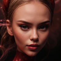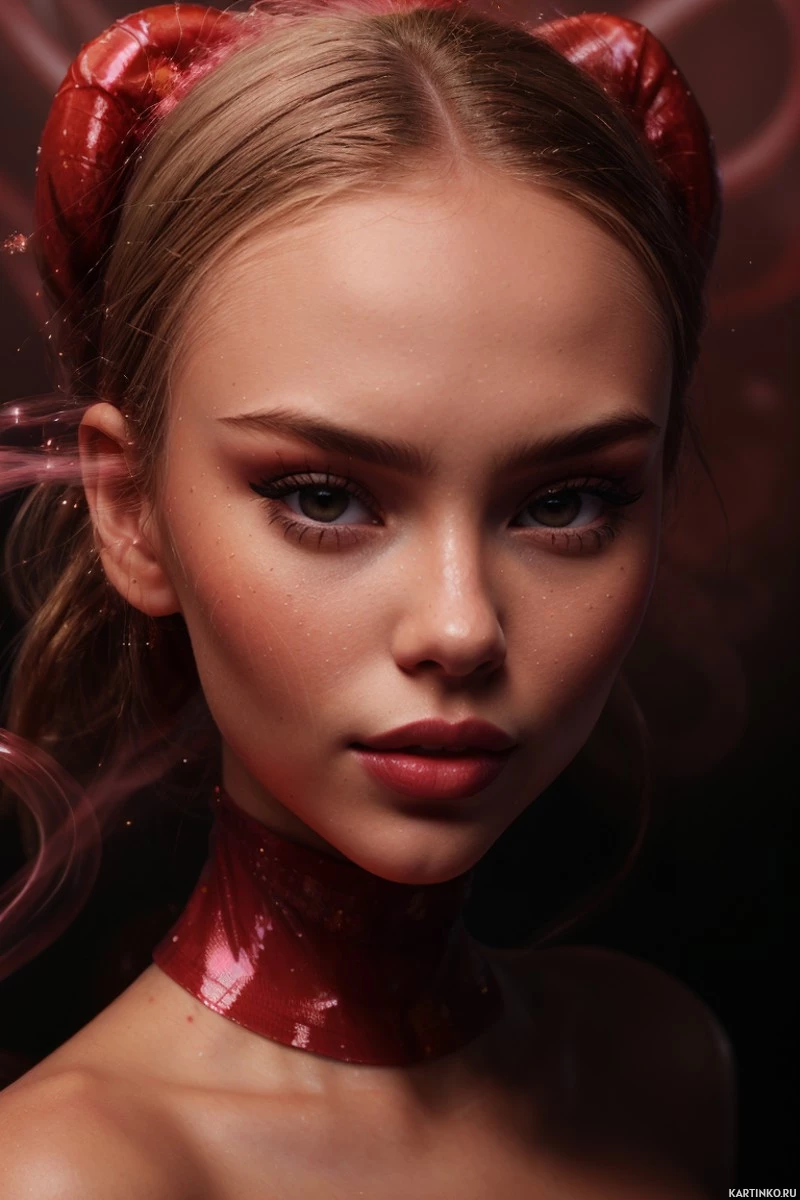 makeup accents on her eyes, lips, and shoulders, giving the impression of devil-like horns or wings. Her facial features are symmetrical and she is looking directly at the camera with