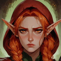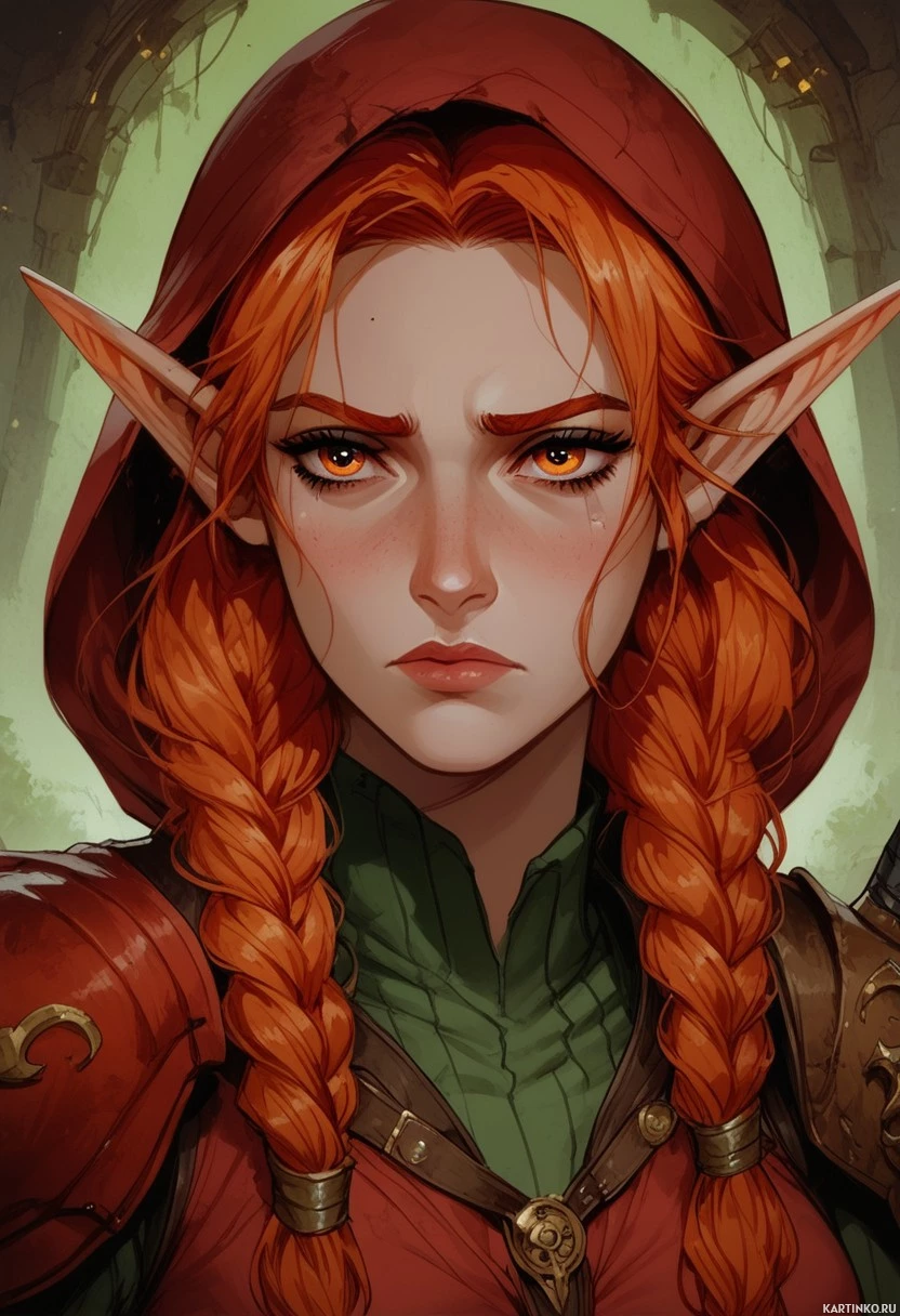 red hair styled in braids and is wearing a hooded cloak with an emblem on the chest area. Her expression seems serious or contemplative. The background suggests