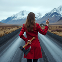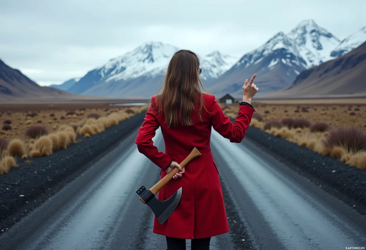 a red coat and has a black axe in her hand. The road appears to be wet, suggesting