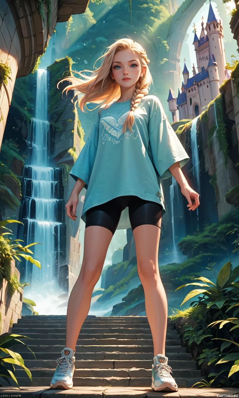 blonde hair, styled in braids, and wearing a light blue athletic top with short sleeves and black shorts. She is standing on what looks like a path leading towards