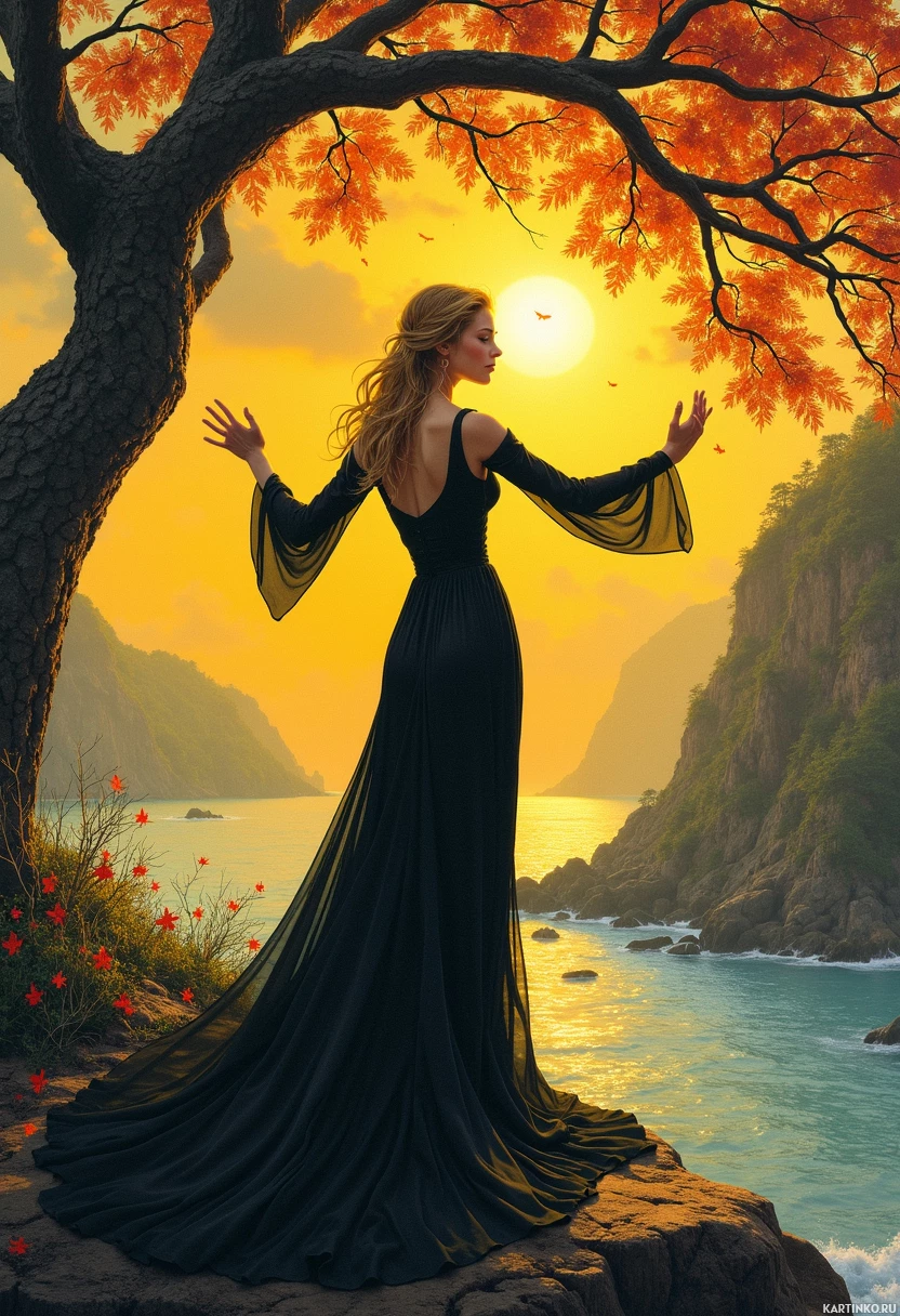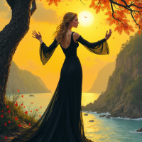 black dress with flowing sleeves that are draped around her shoulders. Her hair is long and appears to be golden blonde in color. She stands with her arms outstretched towards