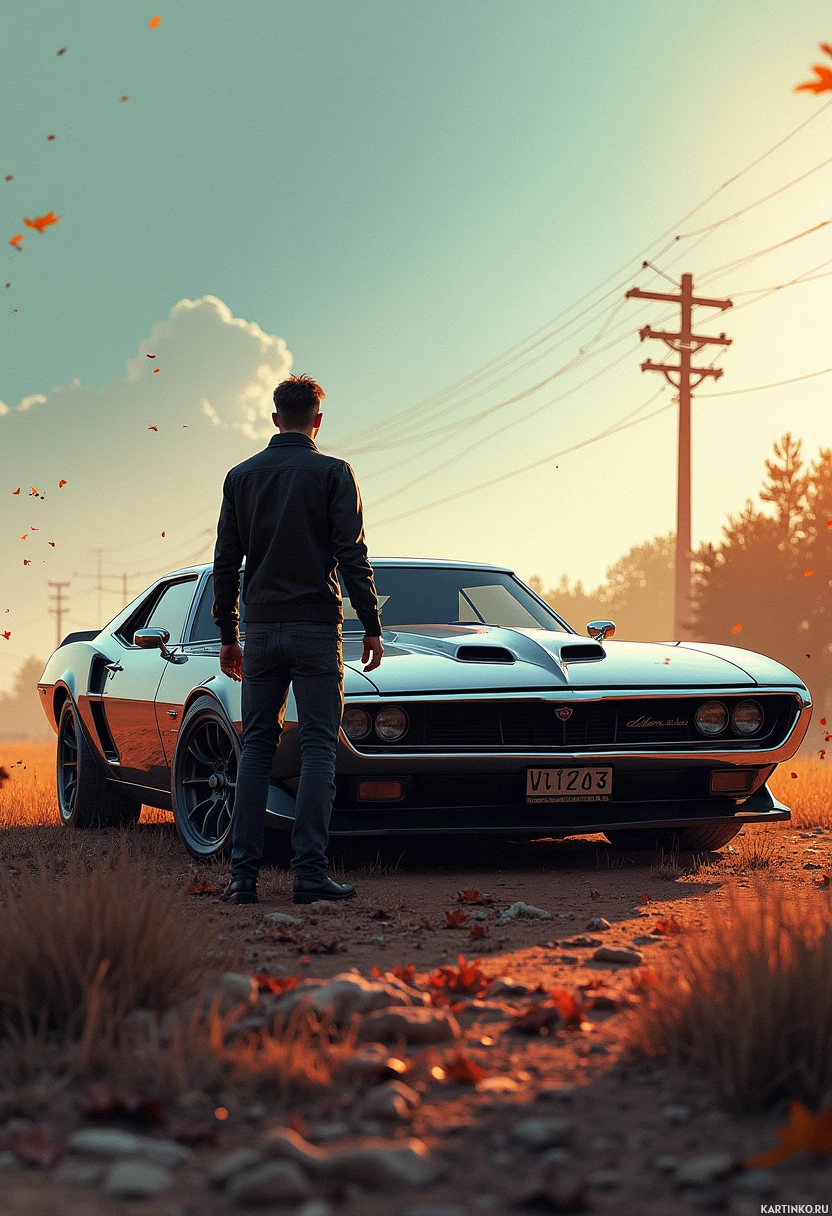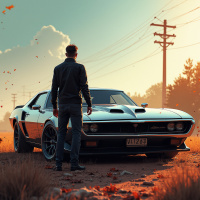 a dynamic composition, with the man framed by the vehicle and the open landscape. It conveys a sense of vintage automotive culture and could be associated with elements from pop culture or classic car enthusiasts.