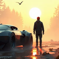 a beach at sunset. The individual is wearing a light-colored jacket and seems to be observing something off-camera. To the right of this figure stands a sleek