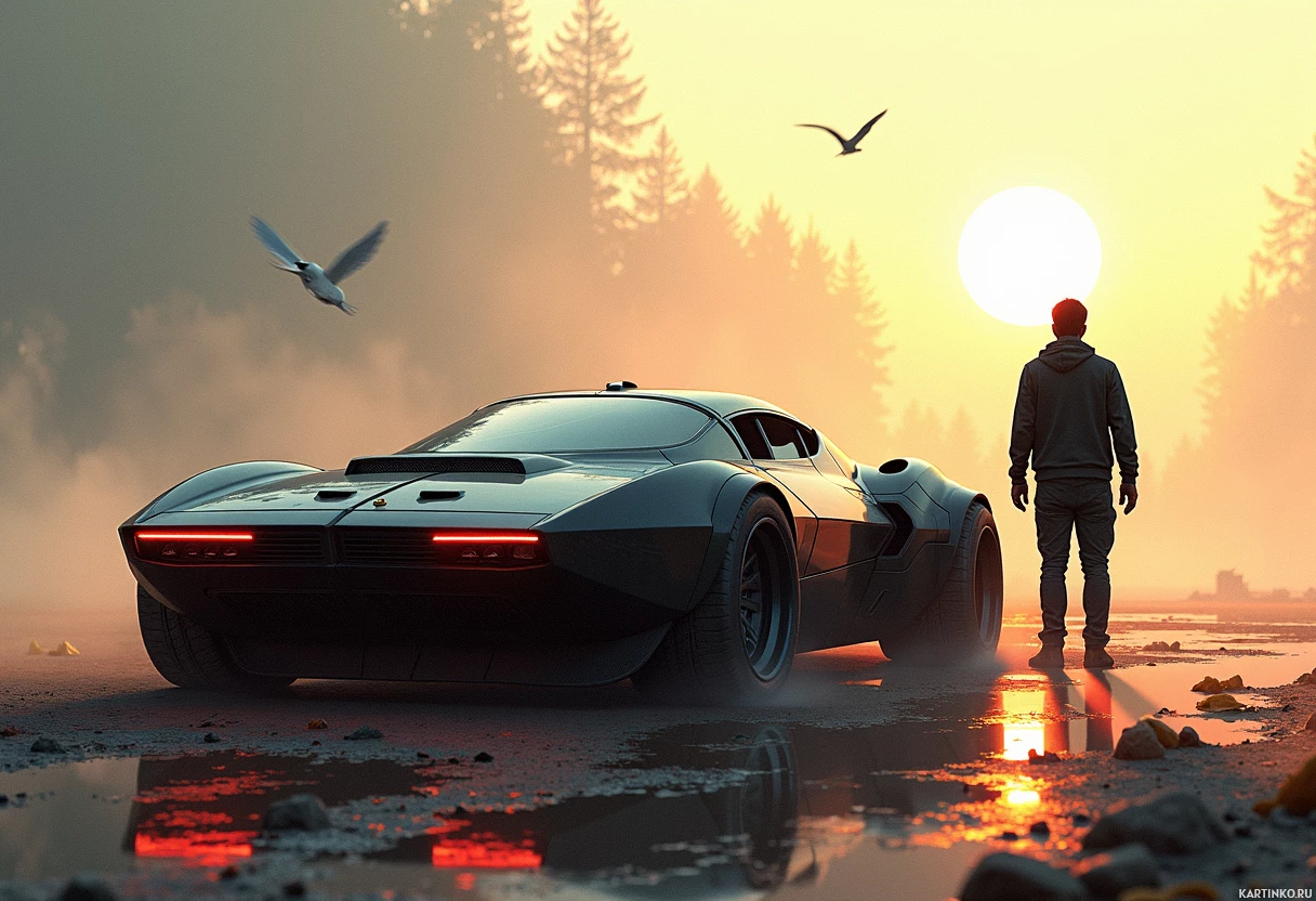 performance vehicle. In the background, there is an expansive landscape featuring a body of water and silhouettes of trees under the setting sun, which casts