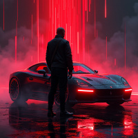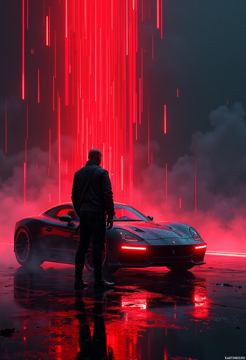 visual effect is used to create a sense of motion or energy around the man and the car, with red lines or streaks emanating from behind them, which could represent speed, power, or some other form of dynamic action in the scene.