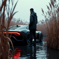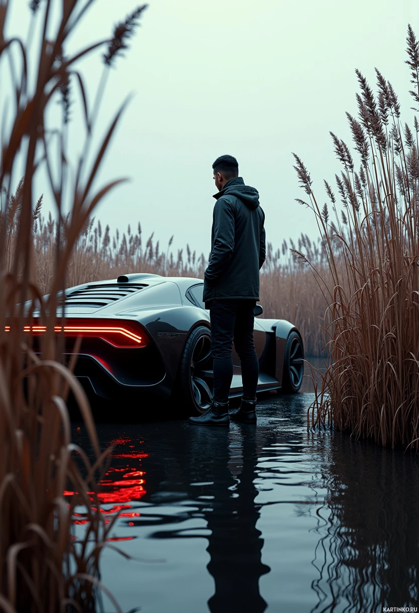 the soft lighting conditions, and there are reeds visible around the vehicle and man, indicating they might be standing in a marsh or a shallow water body. The image does not provide details of any specific brand or model of the car. The overall scene conveys