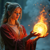 Renaissance attire. In her left hand, she holds a sphere that emits flames around it, suggesting that she is casting fire as part of her