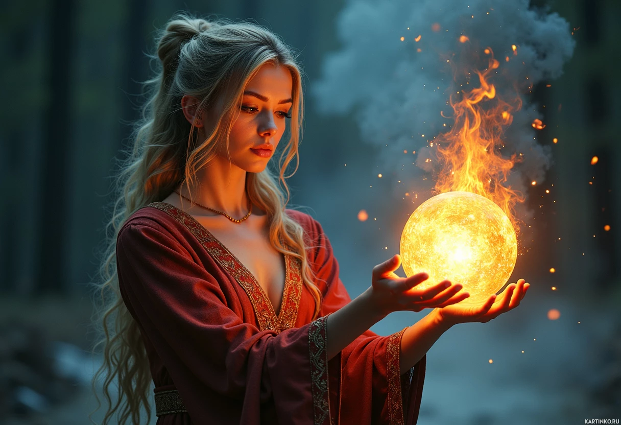 a young woman with long blonde hair, who appears to be engaged in the art of magic. She is wearing what seems to be historical or fantasy-inspired clothing, possibly reminiscent of medieval or