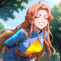 a moment of joy or amusement. She is wearing what seems to be a uniform with some emblems or insignia on it, which could indicate that she is part of an organization or team within the context of the show she is from. The background is simple and does not distract from the character, focusing attention on her as the main subject of the image.
