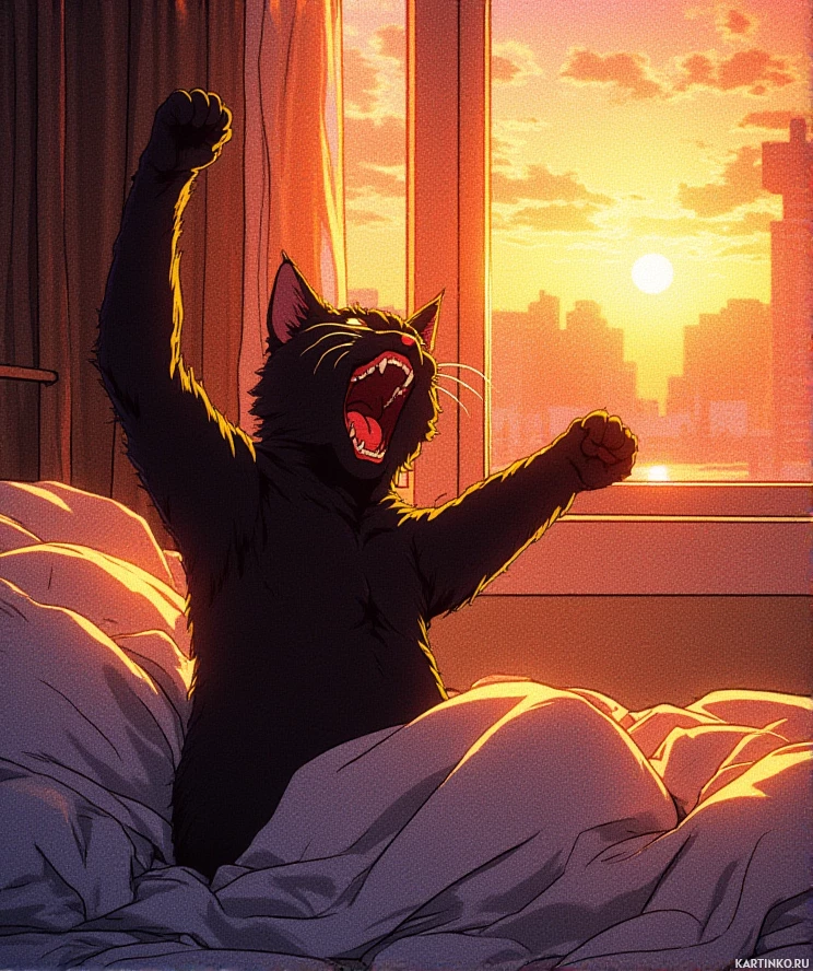 На картинке чёрный кот сидит на кровати. Он словно радуется, с широко открытым ртом и поднятыми лапами, как будто болеет за кого-то. За окном, виднеющимся в комнате, закатное солнце окрашивает город в тёплые тона.