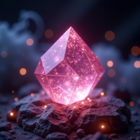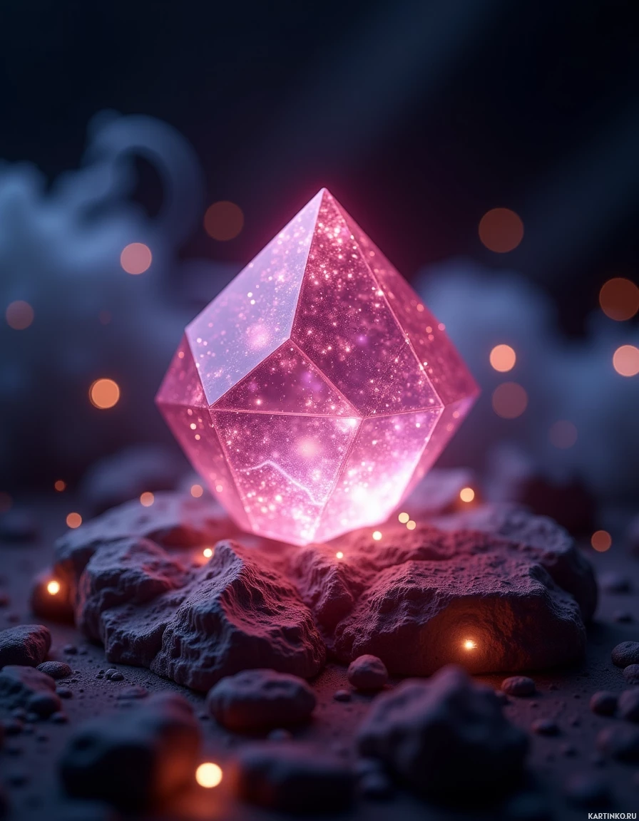 На картинке возвышается крупный розовый бриллиант, сияющий на фоне потрескавшейся земли или скалы. Вокруг него – небольшие камни и сферы, излучающие оранжевый и красный свет, создавая неземную атмосферу. На заднем плане видны элементы космического пространства: звёзды и луна, что подчеркивает космическую тематику.
