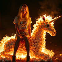 a young woman seated on what appears to be a unicorn made of fire. She is sitting in profile, facing away from the camera. Her hair is blonde and she has