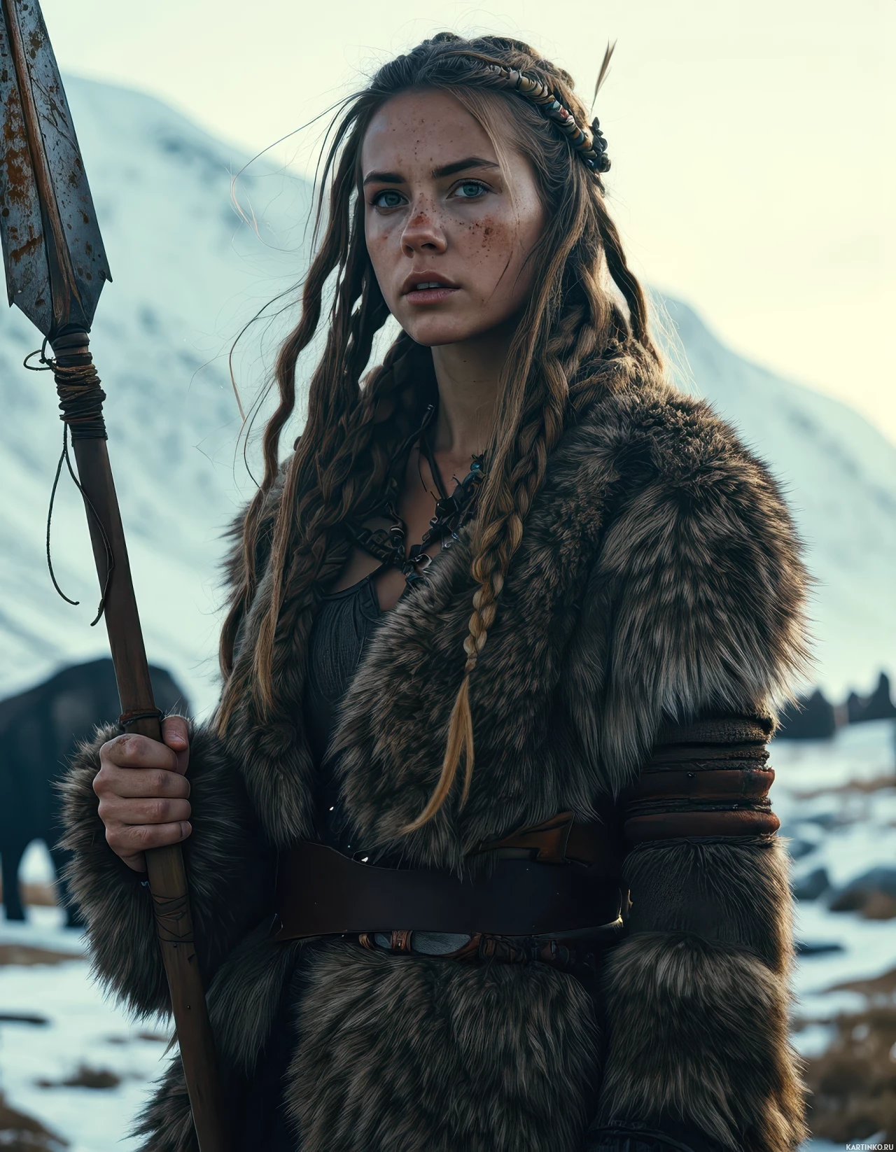 long hair that appears to be braided and is wearing a fur-lined outfit with a belt around the waist. They are holding a weapon that resembles a lance or spear, which is held upright at shoulder height. The setting seems to be outdoors in an icy landscape, as suggested by the frozen ground and the snow-covered