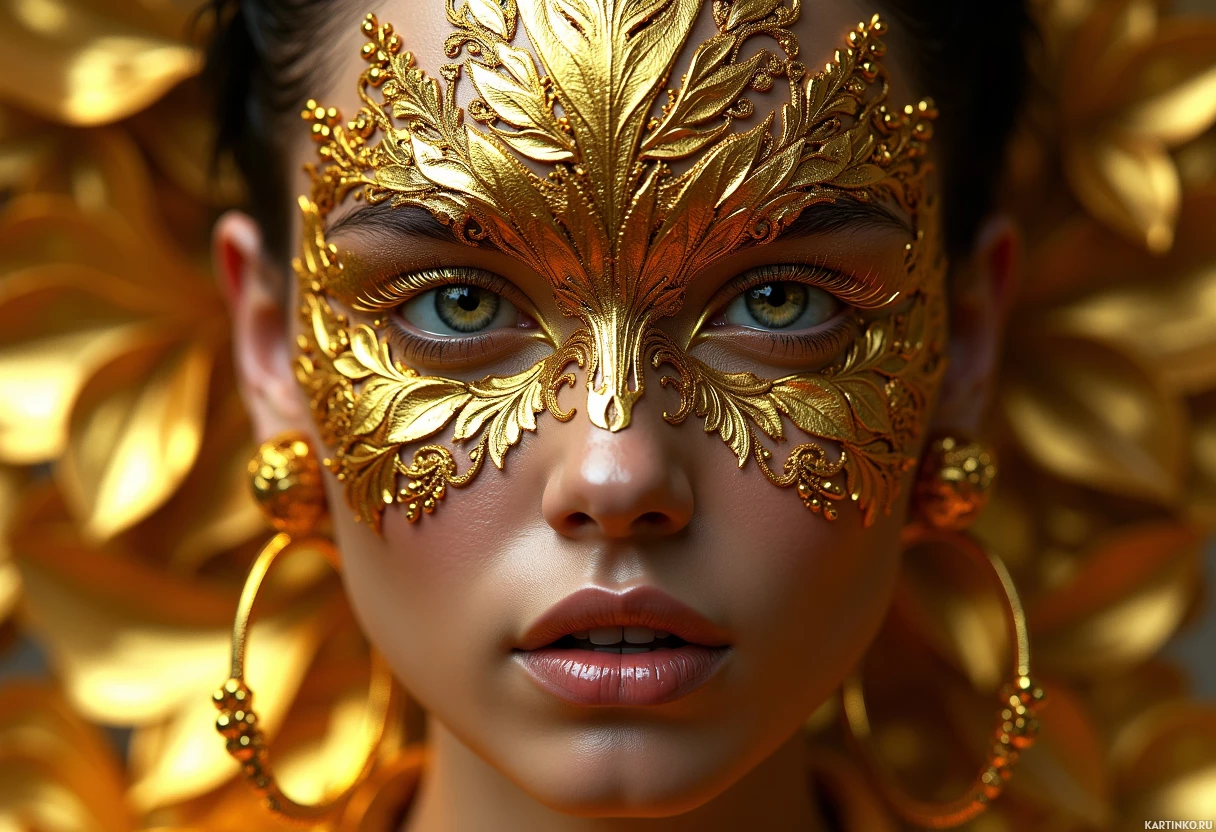 На картинке изображена женщина с каштановыми волосами. На её лице золотая маска, закрывающая глаза, и вокруг лица, а также на серьгах – декоративные золотые элементы. Взгляд направлен немного в сторону, будто она смотрит вдаль с невозмутимым выражением лица. Картинка отличается высокой детализацией и, вероятно, является профессиональной фотографией.