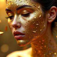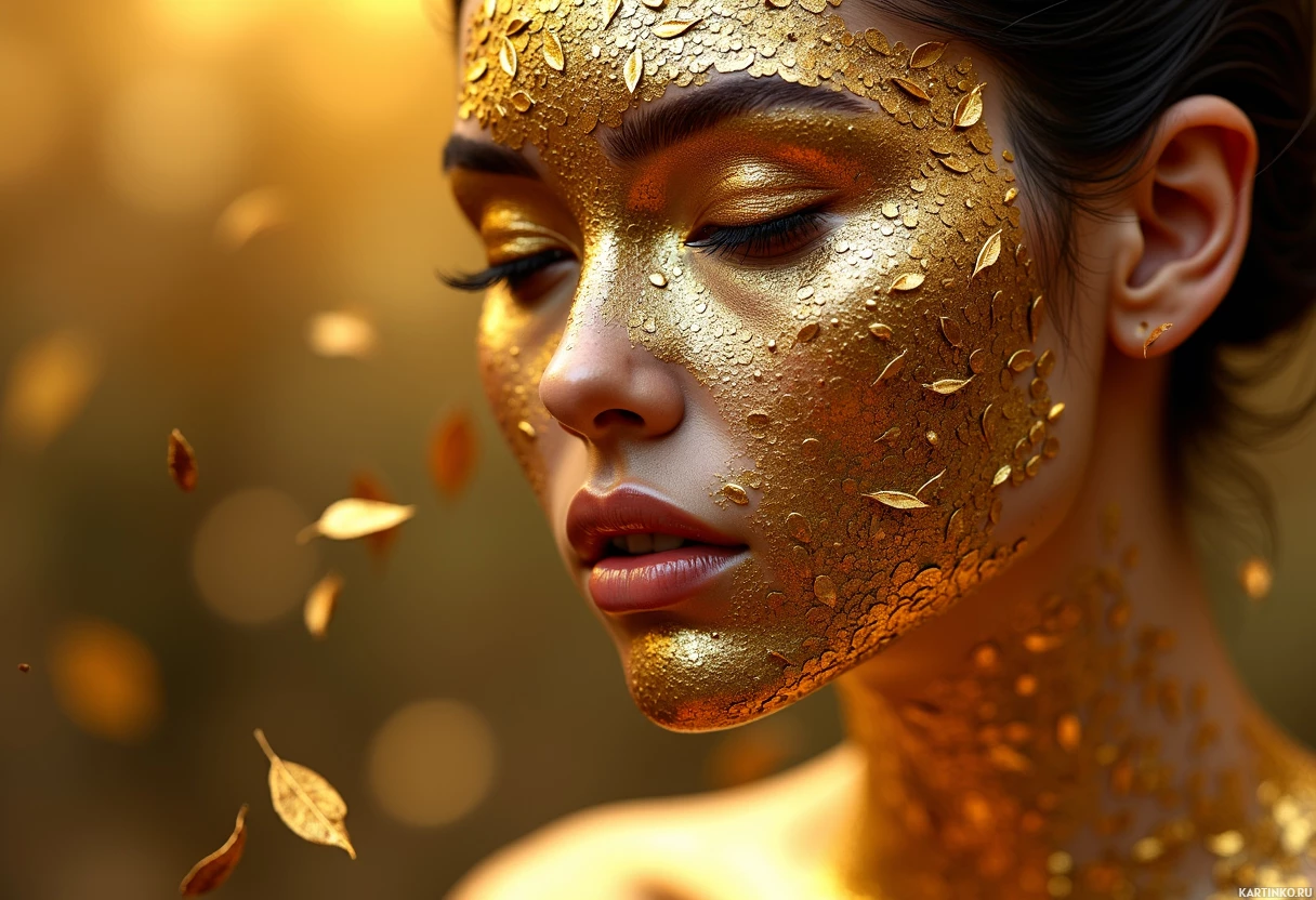 an atmosphere of introspection or peacefulness. Her expression is one of calmness or contemplation. Around her face, there are fallen leaves that seem to blend with her golden appearance, suggesting a connection between nature and her adornment. The overall effect is quite ethereal and artistic.