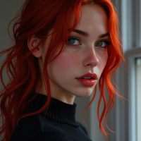 На картинке изображена женщина с ярко-рыжими волосами. У неё светлая кожа, и она смотрит немного в сторону, не в камеру. Выражение лица нейтральное, можно сказать, задумчивое. На ней чёрный топ, который эффектно контрастирует с цветом её волос. На заднем плане виден оконный проём, создающий ощущение интерьера.