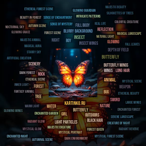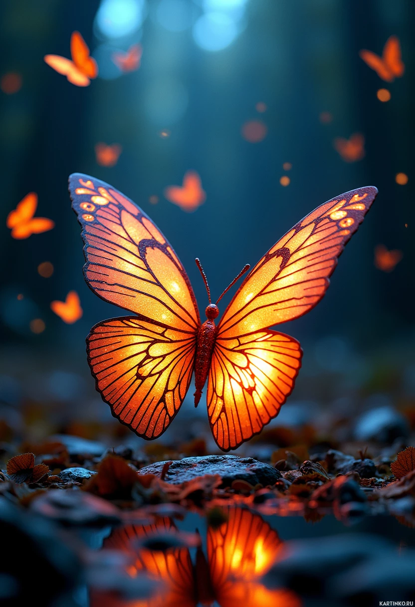 Картинка: Светящаяся, ярко окрашенная бабочка с крупными оранжевыми крыльями и черным телом, присела на камень в ночной лесной чаще. На заднем плане – силуэты деревьев на фоне звездного неба.