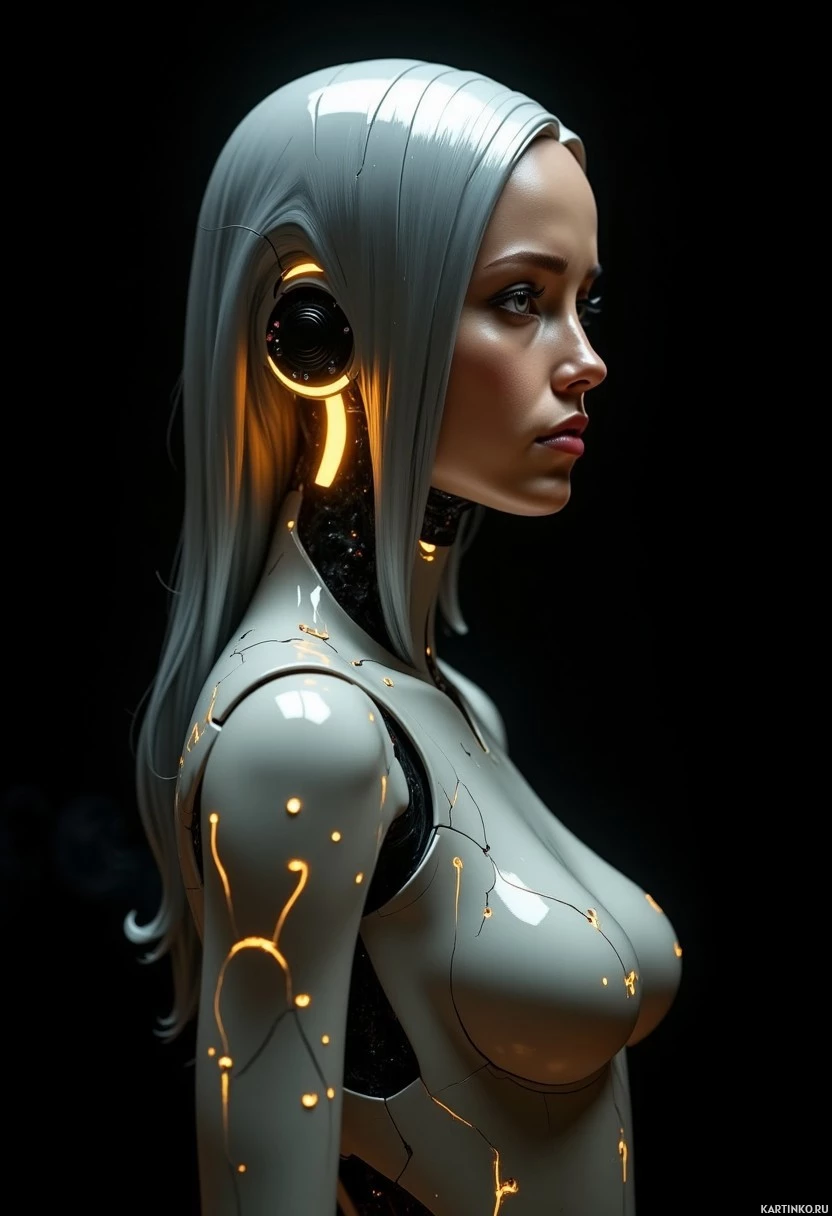 a female character with white hair and what appears to be a robotic or cybernetic body. She is depicted in a close-up portrait, giving