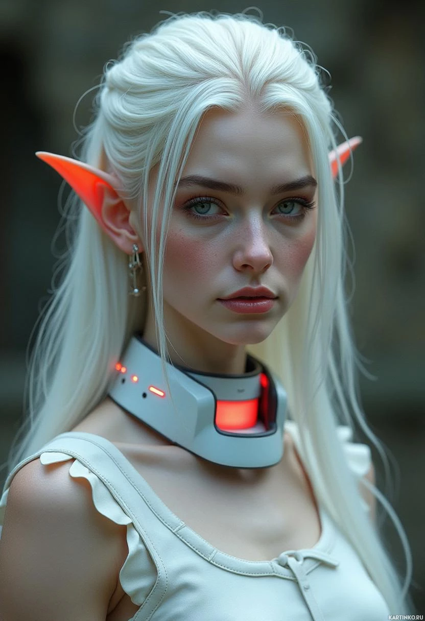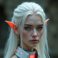 a serious expression. She has pointed ears resembling those of an elf, which is often associated with fantasy themes. She is wearing