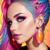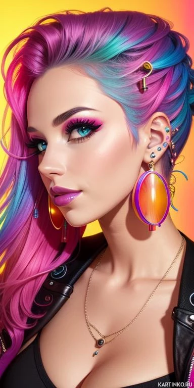 multiple colors around the iris, suggesting an artistic or fantasy element to her appearance. She is also wearing