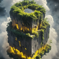 multiple levels with varying heights and openings on each level that could be windows or doorways. Vegetation, including greenery and plants, are growing on and around the building, adding to its otherworldly appearance. A small
