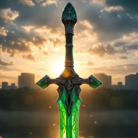 green color with intricate details along its blade and hilt. The handle of the sword is wrapped in a darker material, possibly leather or a similar texture. The blade exhibits