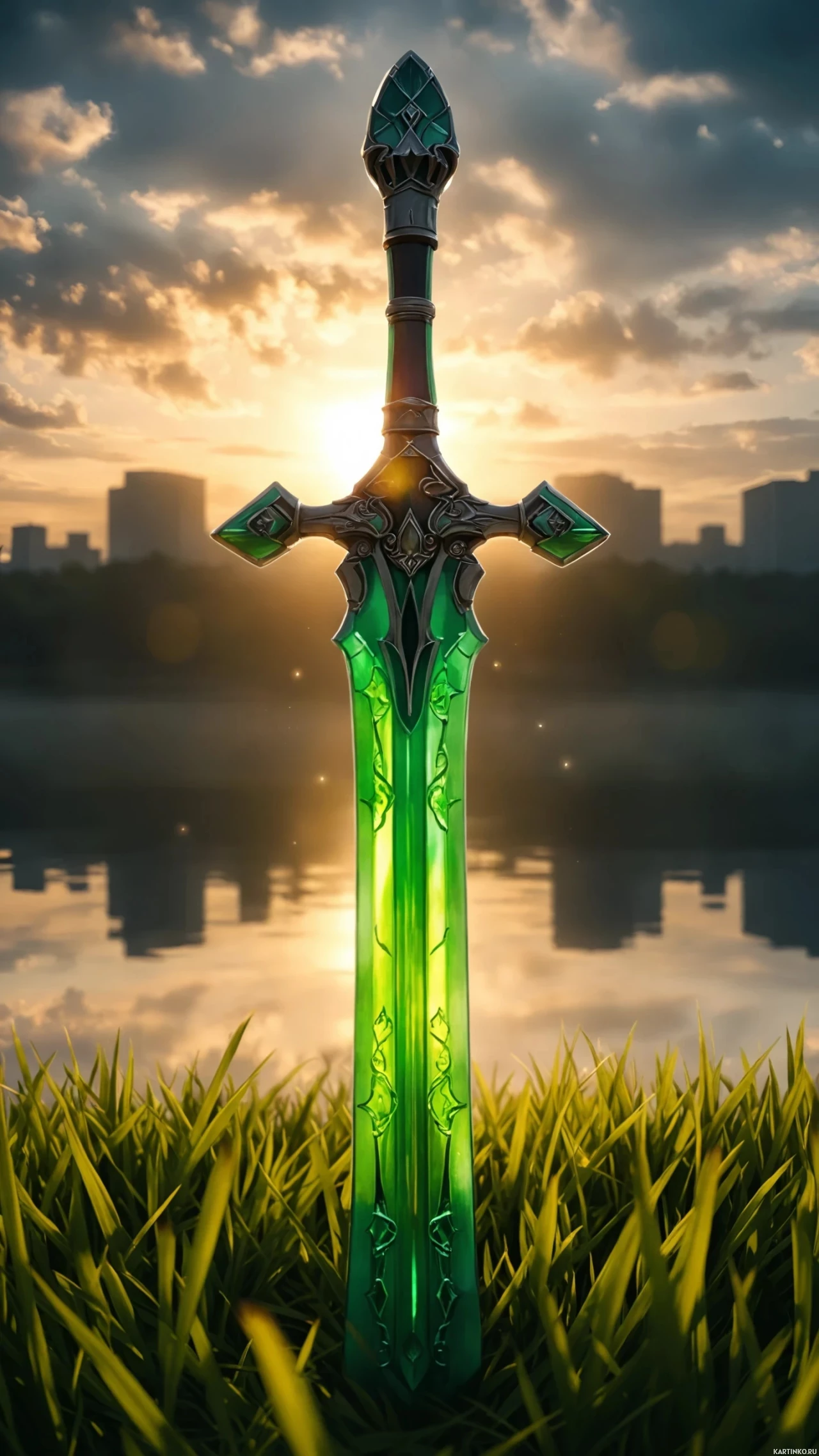 The image features a vibrant, elongated sword lying on a bed of grass. It has a bright