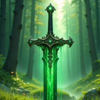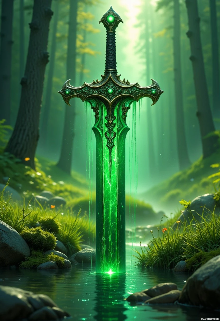 intricate designs on its hilt and blade, suggesting it might be of significance or magical in nature. It's resting on what appears to be a mossy surface near water, possibly