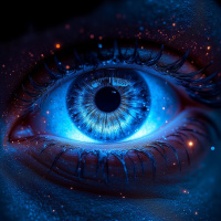 circular patterns that create a dynamic effect. The pupil appears dilated, suggesting attentiveness or possibly even transcendental perception. The eyelashes are visible and add to the detail of the image. Surrounding the eye are cosmic elements like stars and nebulas, depicted in hues of