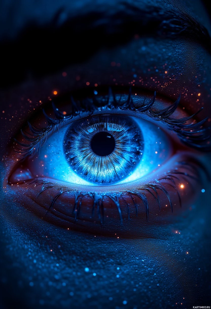 The image features a close-up of an individual's eye, which is the central focus. The iris is vividly blue with concentric