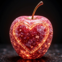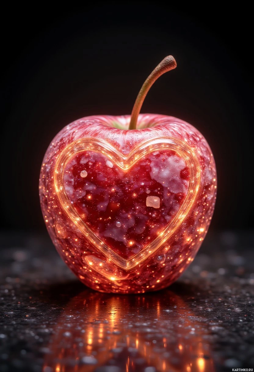 На картинке изображено яблоко, вырезанное или слепленное в форме сердца. Дизайн сердца наполнен чем-то, похожим на сверкающую красную субстанцию, что придает ему волшебный и сияющий эффект. Это необычная работа выделяется на нейтральном фоне.