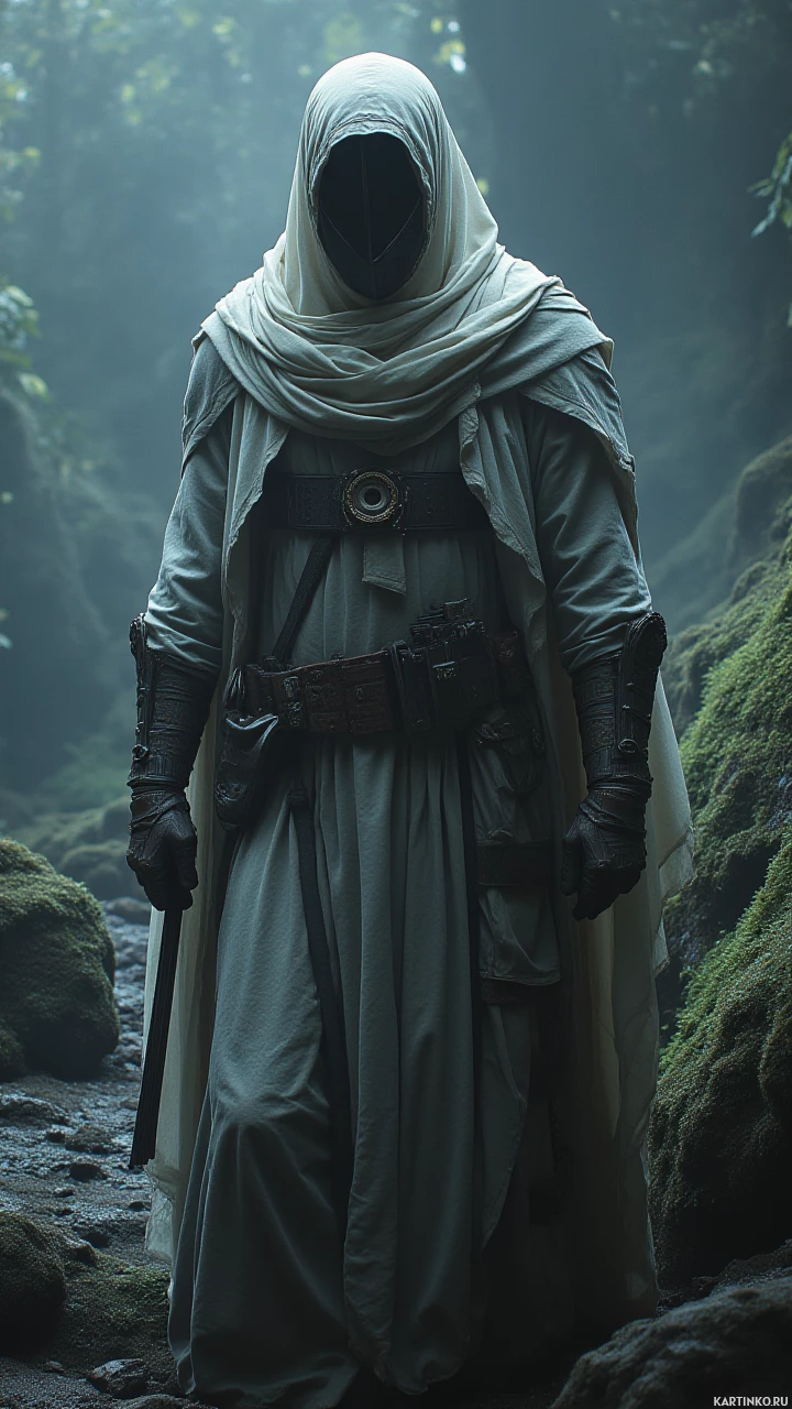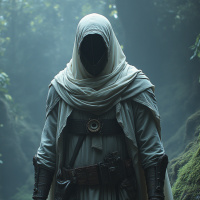 forested area. This individual is clad entirely in white, with the face obscured by a hood that has been pulled down over their eyes. They are holding a bow and quiver on one shoulder, suggesting readiness for hunting or combat. The attire includes a cloak that drapes around them, enhancing the mystique of the character's identity. The clothing style suggests a historical or