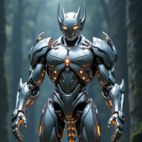 orange accents on its joints. The background depicts an eerie forest or