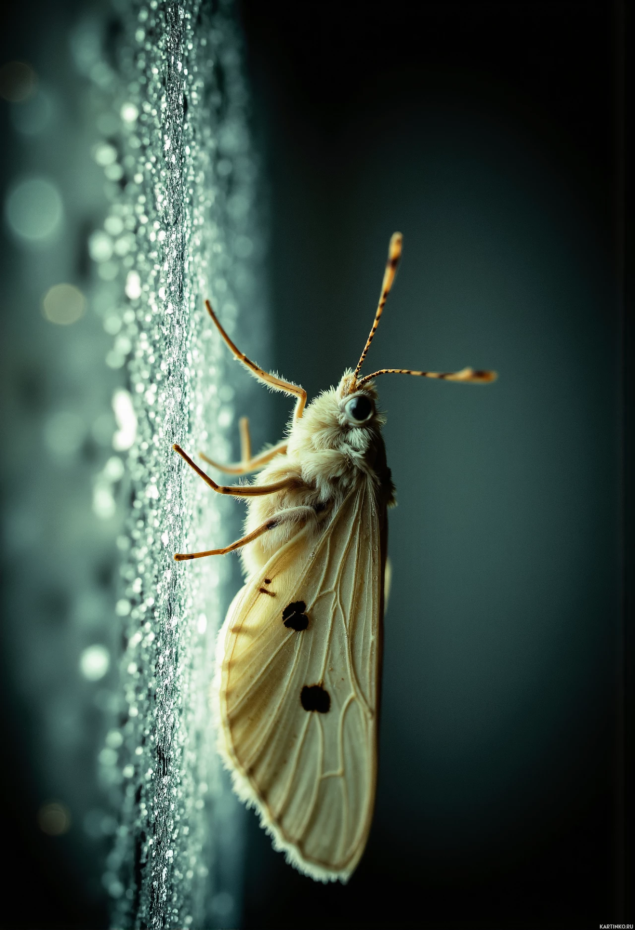 compound eyes and antennae that are longer than its body length. There is moisture condensation on the surface it's resting against, suggesting humidity or