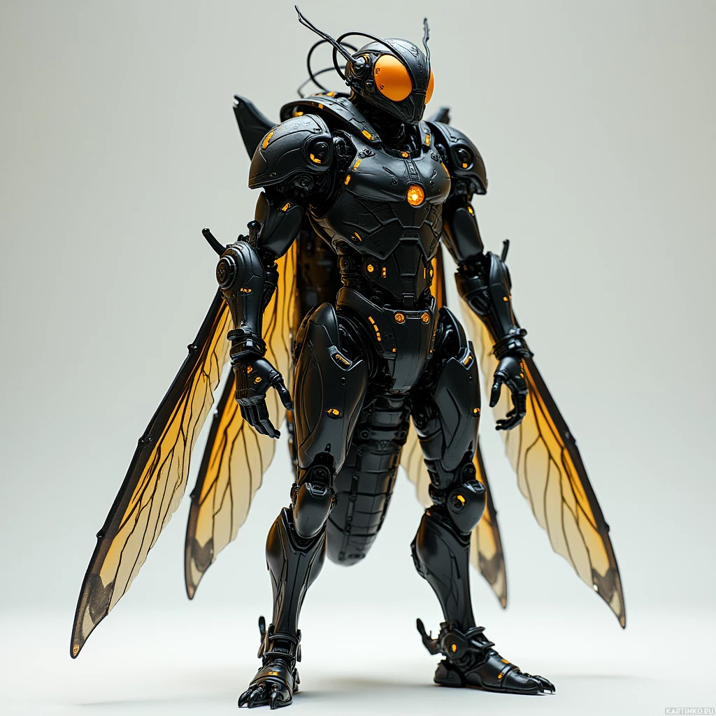 mechanical parts. It features multiple wings that spread out from its back and arms that end in what appear to be