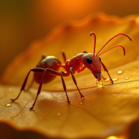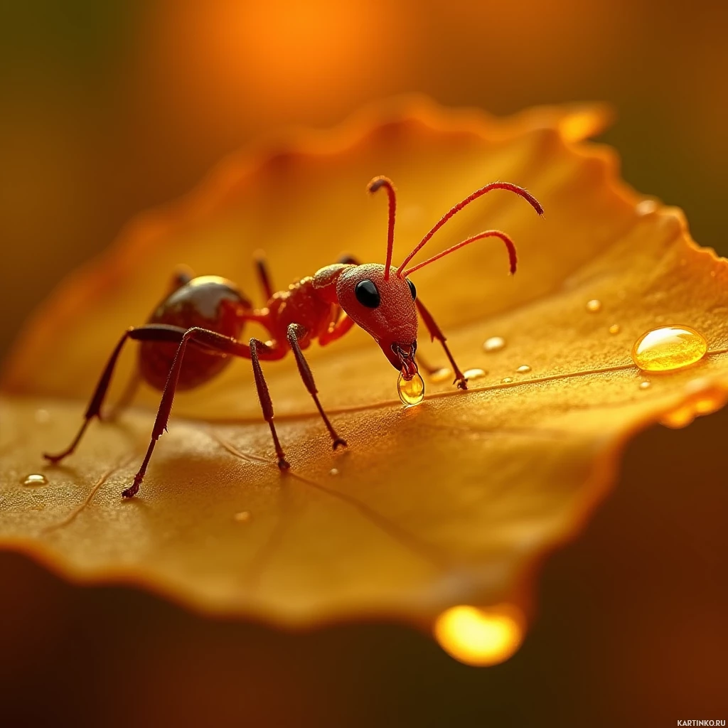 an autumn tree, and there are drops that could be water or nectar on its surface. The ant is oriented towards the viewer, facing slightly left with its body mostly obscured by the leaf. Its antennae and legs are visible as it stands on what appears to be a vein of the leaf. The background is blurred, which makes it difficult to discern specific details about the surroundings, but it seems to be