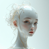 facial expression is neutral. Her eyes are downcast. There appears to be some sort of metallic or gold-toned material on her right side, which could be interpreted as