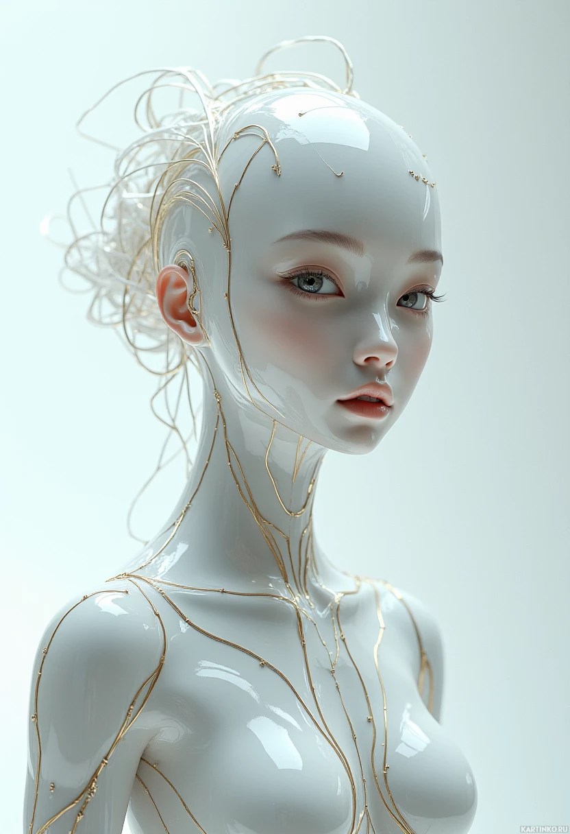 a female figure with an intricate design. She has pale skin, light hair, and her